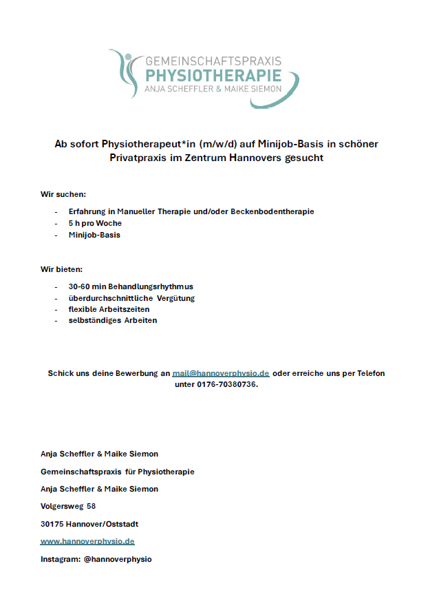 Physiotherapeut*in (m/w/d) auf Minijob-Basis in schöner Privatpraxis im Zentrum Hannovers gesucht