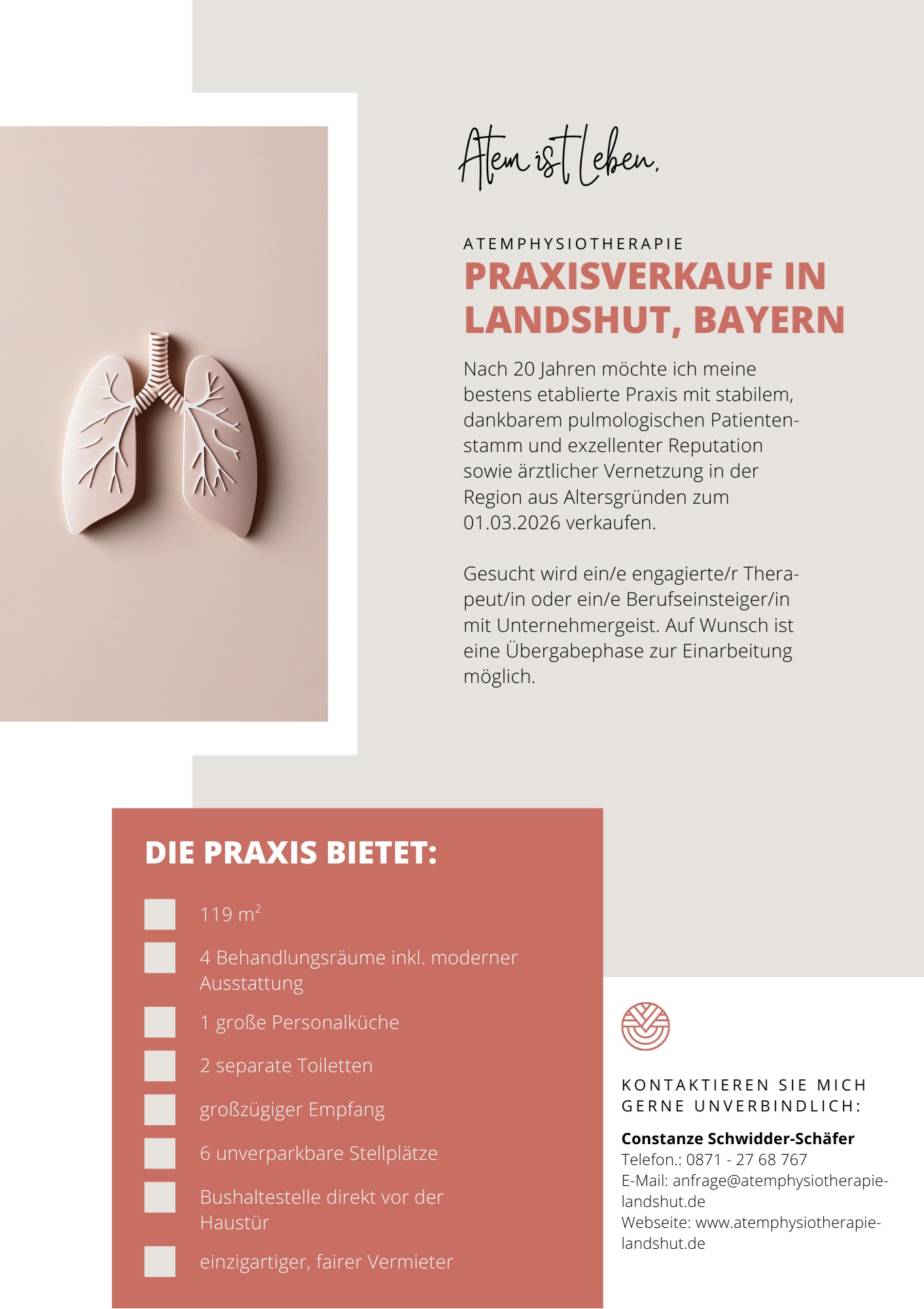 Eine langjährig gut laufende Praxis für Physiotherapie wird aus Altersgründen ab 2026 abgegeben.