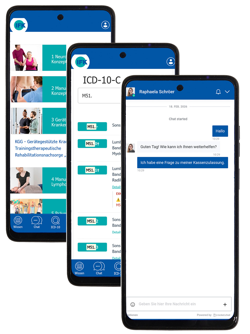 Über einen integrierten Chat der App können Mitglieder unmittelbar mit den zuständigen Beratungsteams der IFK-Geschäftsstelle aus den Bereichen Zulassung, Abrechnung und Fortbildung kommunizieren. Der direkte Kontakt ermöglicht es, Fragen aus dem Praxisalltag schnell und unkompliziert zu klären.
