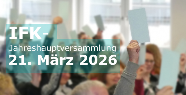 Der Vorstand des IFK lädt alle Mitglieder herzlich zur Jahreshauptversammlung (JHV) ein, in der über das vergangene Geschäftsjahr berichtet wird. Sie findet am 21. März 2026 in den Räumlichkeiten des IFK-Fortbildungszentrums in Bochum statt. Um 10:30 Uhr wird die Jahreshauptversammlung eröffnet und endet circa um 16:30 Uhr.