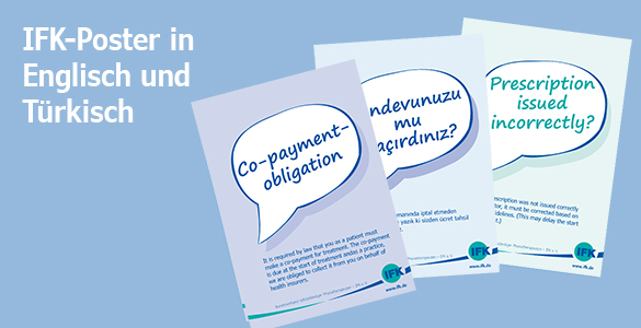 IFK-Mitglieder können die Poster mit den Botschaften „Zuzahlungspflicht“, „Rezept falsch ausgestellt?“ und „Termin verpasst?“ jetzt auch in englischer und türkischer Sprache im internen Mitgliederbereich auf der IFK-Webseite herunterladen. Dort sind neben den Postern auch die Buttons mit denselben Botschaften zu finden, die beispielsweise auf der eigenen Praxiswebseite eingebunden werden können.
